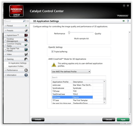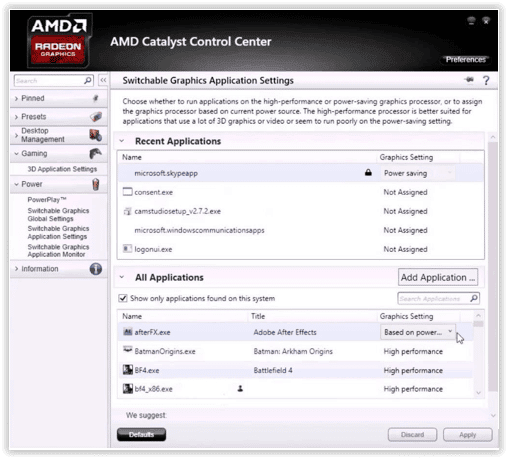 Si votre Catalyst Control Center dispose de l’onglet « Graphiques commutables », cherchez l’application à optimiser (exemple : « C:\Program Files\Bentley\ContextCapture Center\bin\CCMaster.exe ») et attribuez le mode « Haute Performance ».