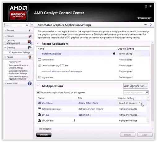 Si votre Catalyst Control Center dispose d’un onglet Graphiques commutables, recherchez votre application (par exemple, C : Program Files Bentley ContextCapture Center bin CCMaster.exe) et définissez-la à « Haute Performance ».