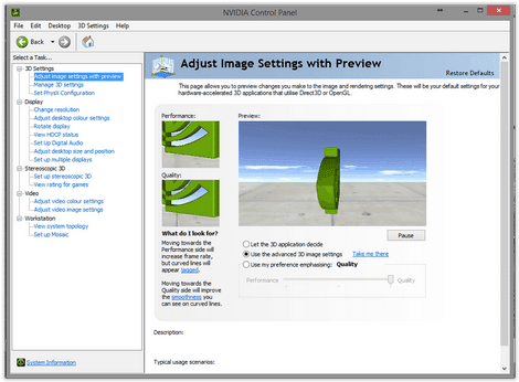 Pour un GPU NVIDIA, ouvrez « Ajuster les paramètres d’image avec l’aperçu ». Sélectionnez « Utiliser les paramètres avancés d’image 3D », puis appliquez.