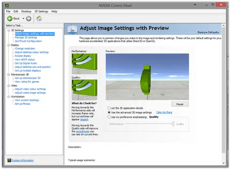 Pour les cartes NVIDIA , cliquez sur Ajuster les paramètres d’image avec l’aperçu. Sélectionnez ensuite Utiliser les paramètres avancés d’image 3D et cliquez sur Appliquer.