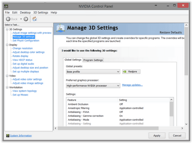 Puis, rendez-vous dans « Gérer les paramètres 3D ». Sélectionnez, dans les paramètres globaux, le processeur NVIDIA hautes performances comme choix principal, et confirmez.