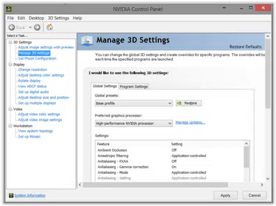 Cliquez sur Gérer les paramètres 3D et ouvrez le menu déroulant Paramètres globaux.
