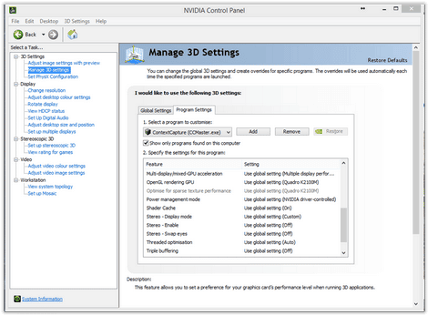 Dans l’onglet des paramètres de programme, cherchez l’application concernée ou ajoutez-la à la liste via le bouton dédié. Indiquez directement son exécutable, par exemple : « C:\Program Files\Bentley\ContextCapture Center\bin\CCMaster.exe » pour ContextCapture.