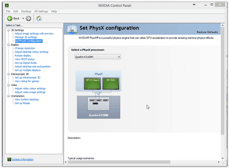 Direction la section « Définir la configuration PhysX » : dans le menu, choisissez la carte NVIDIA comme processeur. Appliquez, puis relancez votre logiciel pour observer le changement.