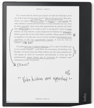 | Commentaire | ⭐⭐⭐⭐ | Bon rapport qualité-prix, 8 Go de mémoire, la valeur sûre de Kobo. ⭐⭐⭐⭐⭐ | ⭐⭐⭐⭐ | Grand écran pour un confort maximal. ⭐⭐⭐⭐ | Grand format, usage mixte travail/lecture. ⭐⭐⭐⭐ |