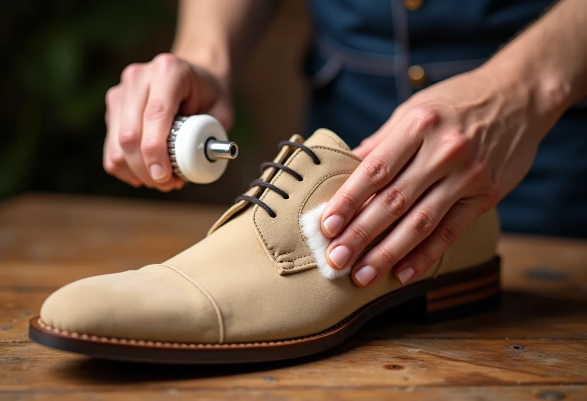 Pour les chaussures en daim, utilisez une brosse en crêpe pour redresser les fibres et enlever la saleté. Si des taches persistent, appliquez du talc et laissez agir quelques heures avant de brosser. Pour des taches tenaces, tamponnez délicatement avec un chiffon imbibé de vinaigre blanc dilué.